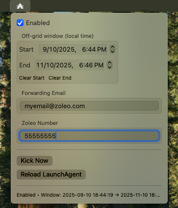 A macOS menubar app that forwards your incoming iMessage/SMS and missed calls to your ZOLEO address — bundled, readable, and only during the window you choose.
